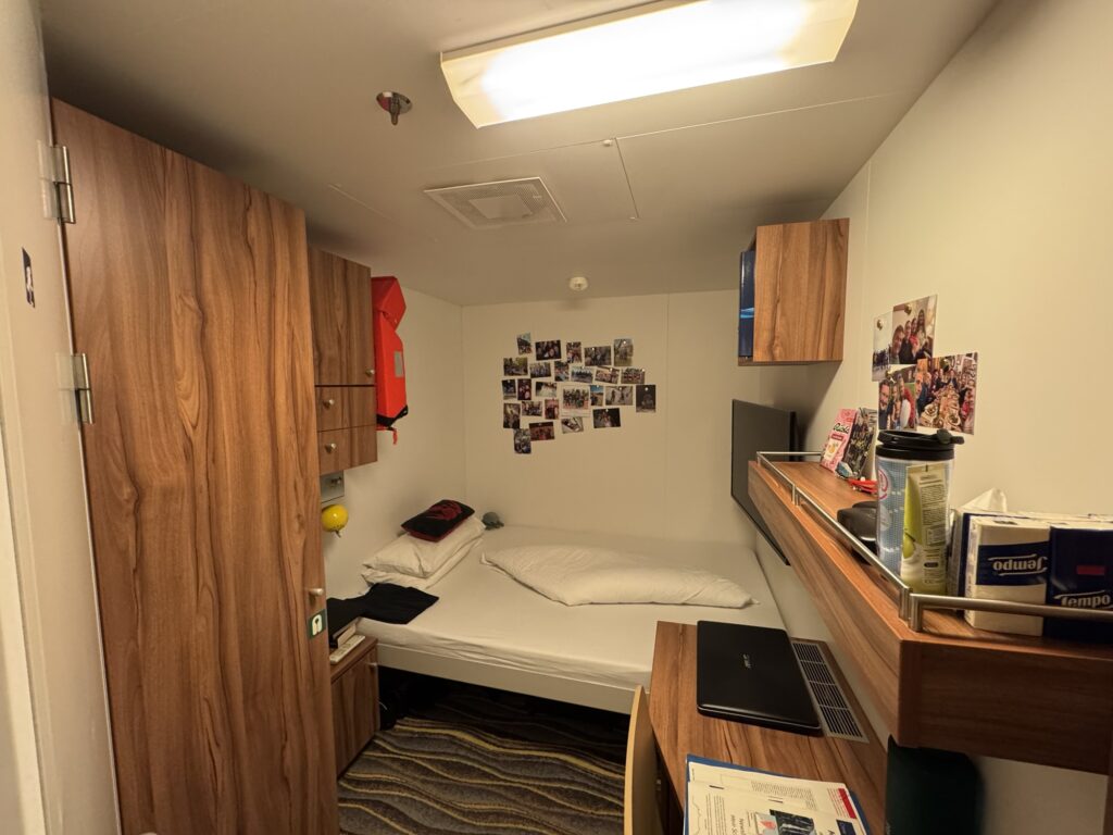 Generell folgen die Tage viele Trainings und es wird noch eine Weile dauern bevor Alltag einzieht. Mit der Kabine hatte ich auf jeden Fall Glück, denn ich habe bereits eine Einzel Kabine mit eigenem Bad bekommen. Und als ich heute Mittag wieder rein kam, war sogar das Housekeeping da gewesen.